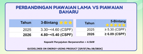 Mulai tahun 2026, Malaysia akan menggunakan ukuran baharu bagi menilai kecekapan tenaga penyaman udara — iaitu Cooling Seasonal Performance Factor (CSPF), menggantikan ukuran lama Energy Efficiency Ratio (EER).